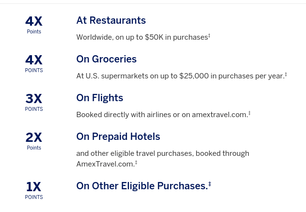 You get a 4X reward point multiplier when you use your AMEX Gold card to pay at Restaurants.